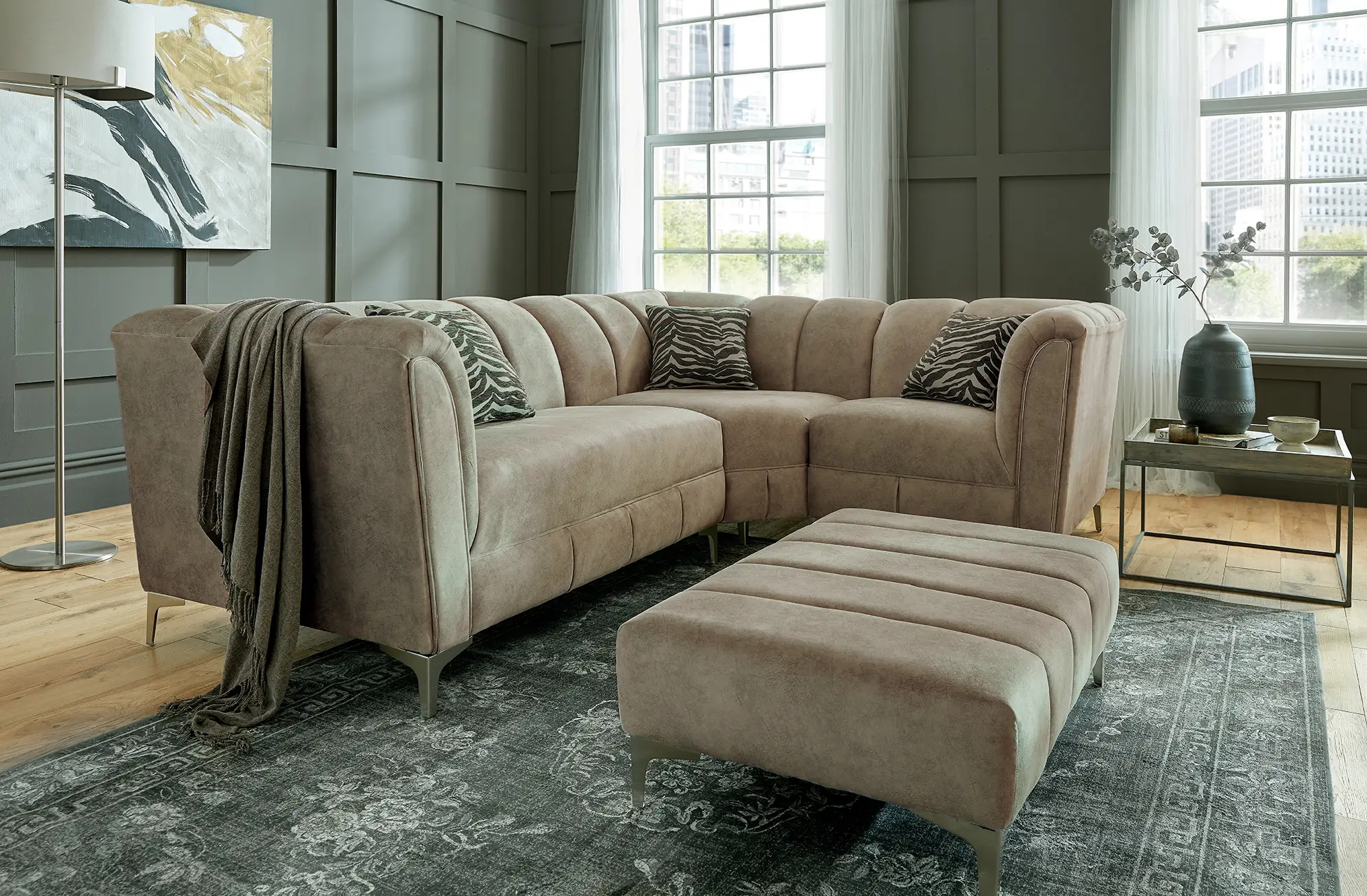 Shown in photo as a 1 Seater- Wedge – 2 Seater and fabric in Palladium Beige but if you wish to tailor your Miami sofa to suit your personal style by choosing from a range of colours and configurations. Whether you’re aiming to enhance your space with elegance or create a cosy, welcoming ambiance, the Miami is the perfect statement piece.