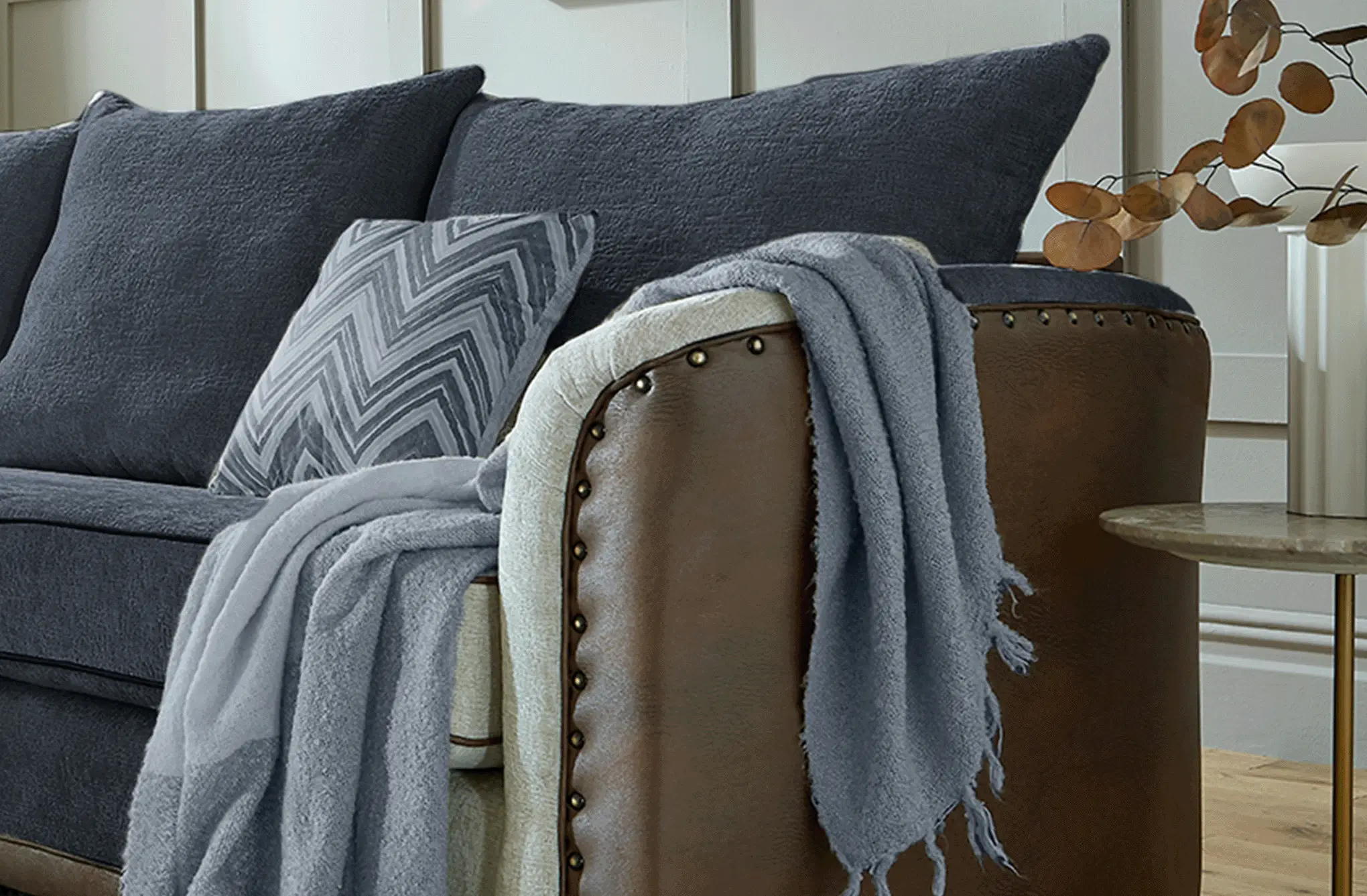 Styled with curvy arms, the Richmond sofa wrapped in an indulgent chenille fabric with faux leather back and sides. It features individually hand crafted studs and angled chromed metal feet.