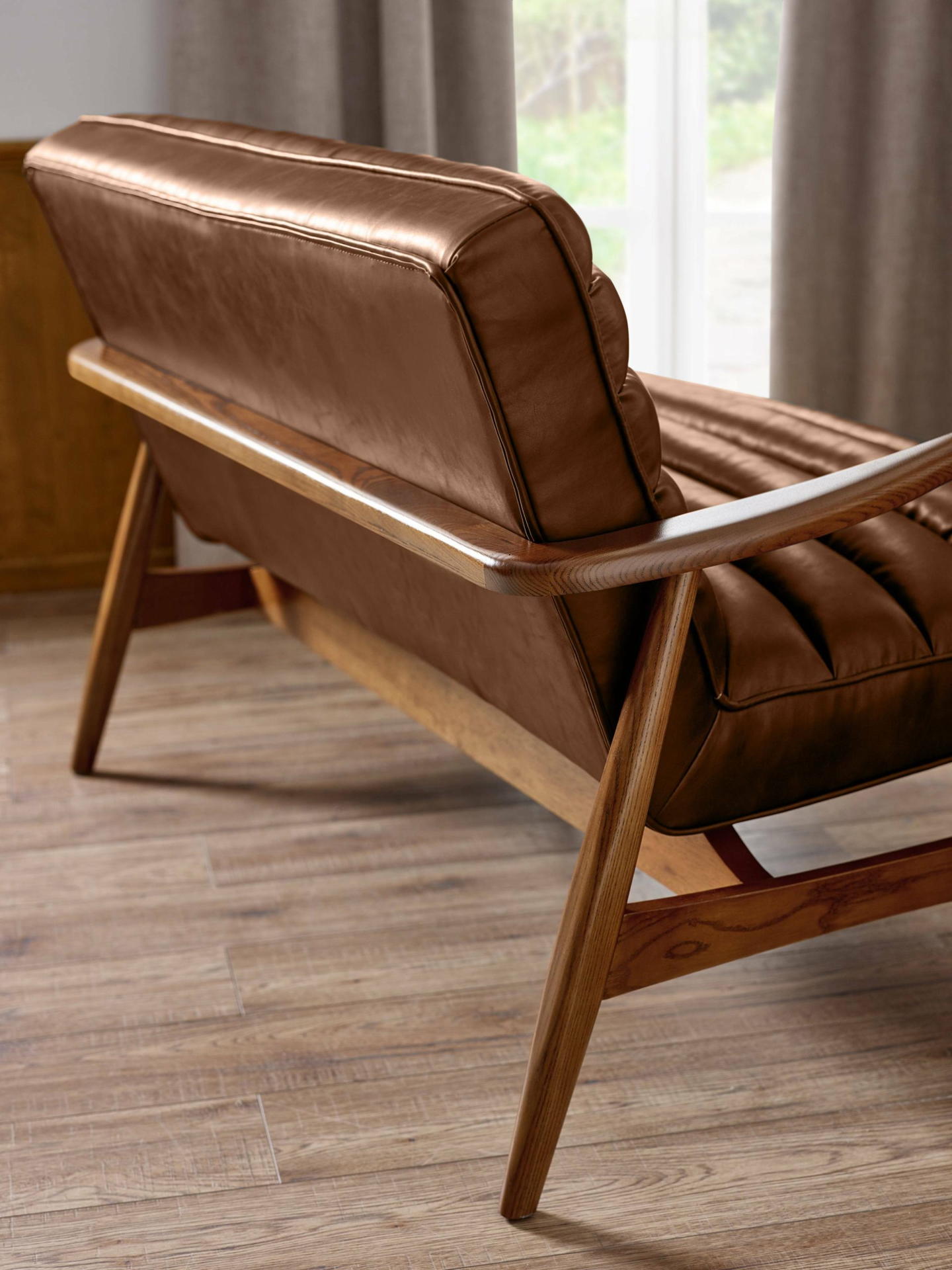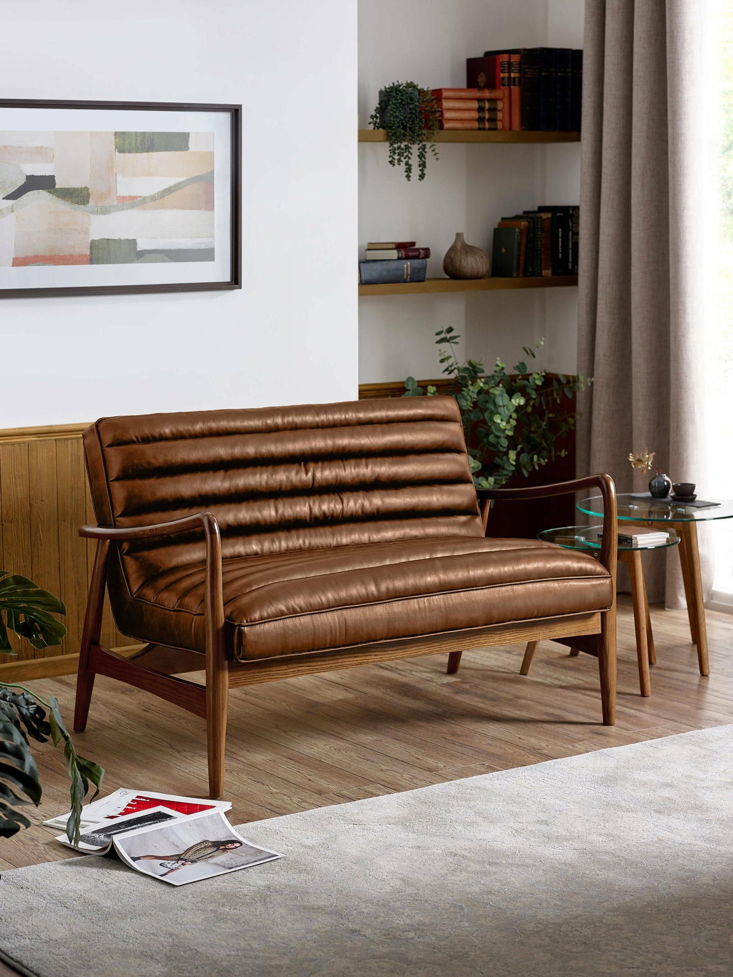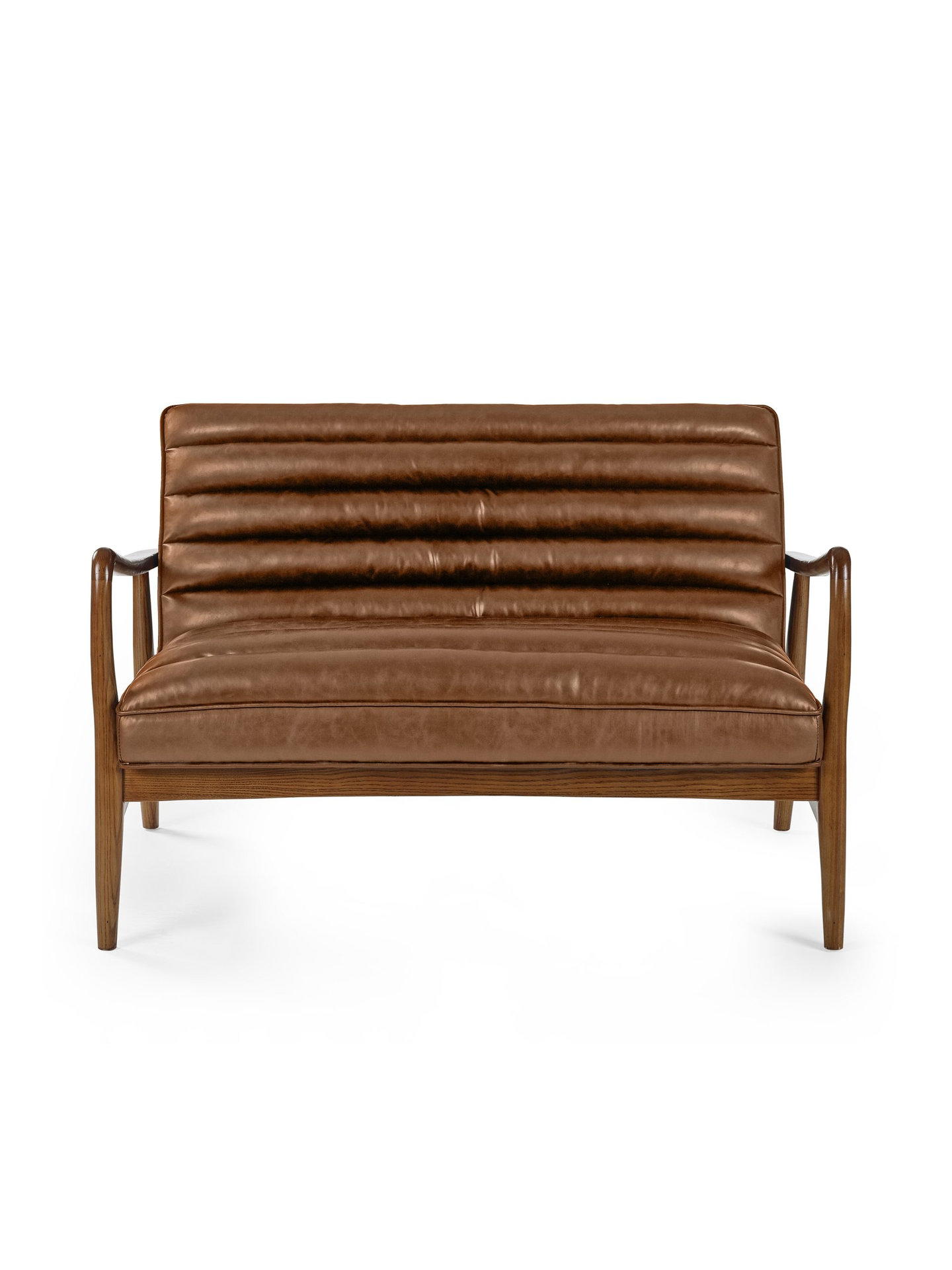Elevate your living space with the Marshall 2-Seater Sofa in Vintage Brown, a perfect blend of style and comfort. Built on a solid oak frame, it offers both durability and timeless appeal. The ribbed cushioned seat and smooth brown faux leather upholstery add a hint of retro sophistication, making it a versatile and eye-catching addition to any home.