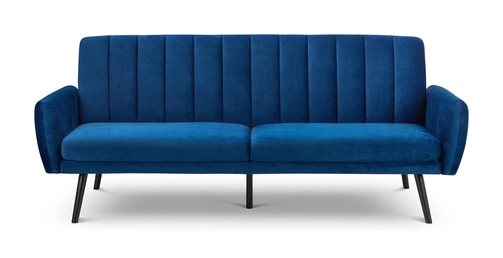 The Afina Sofabed adds glamour to any room, suited for a variety of décor whether glam, modern or mid-century. Upholstered in a luxurious blue velvet with classic statement stitched vertical rows on the back, with black tapered legs giving the sofa a Scandinavian look. The easy to use sleeper function offers a guest bed with utmost comfort, with thick, foam padded cushions.