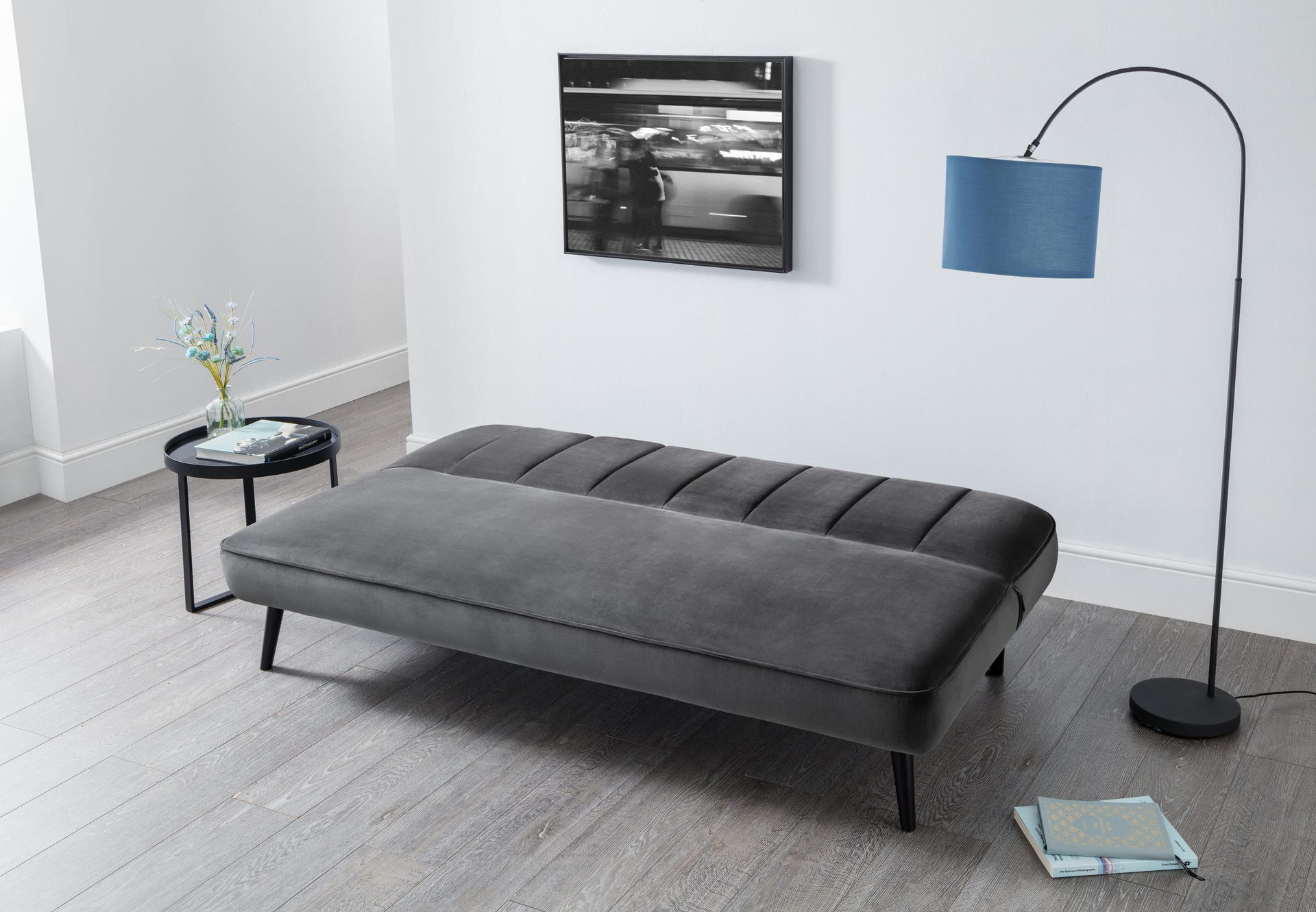 This minimalist, retro-inspired sofabed is compact and functional with an easy click-clack design. Upholstered in luxurious grey velvet fabric, featuring a beautiful curved back and scallop detailing with tapered black legs, this sofabed will suit a range of modern interiors.