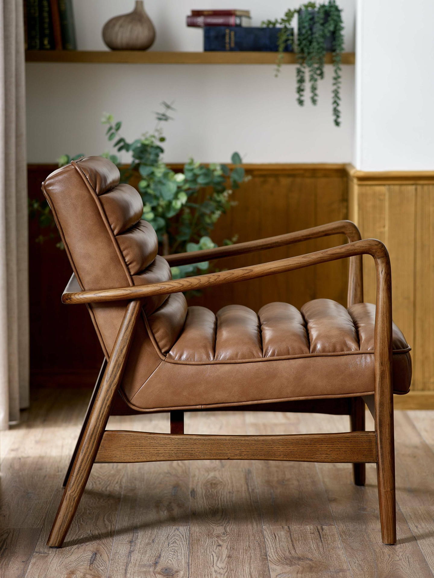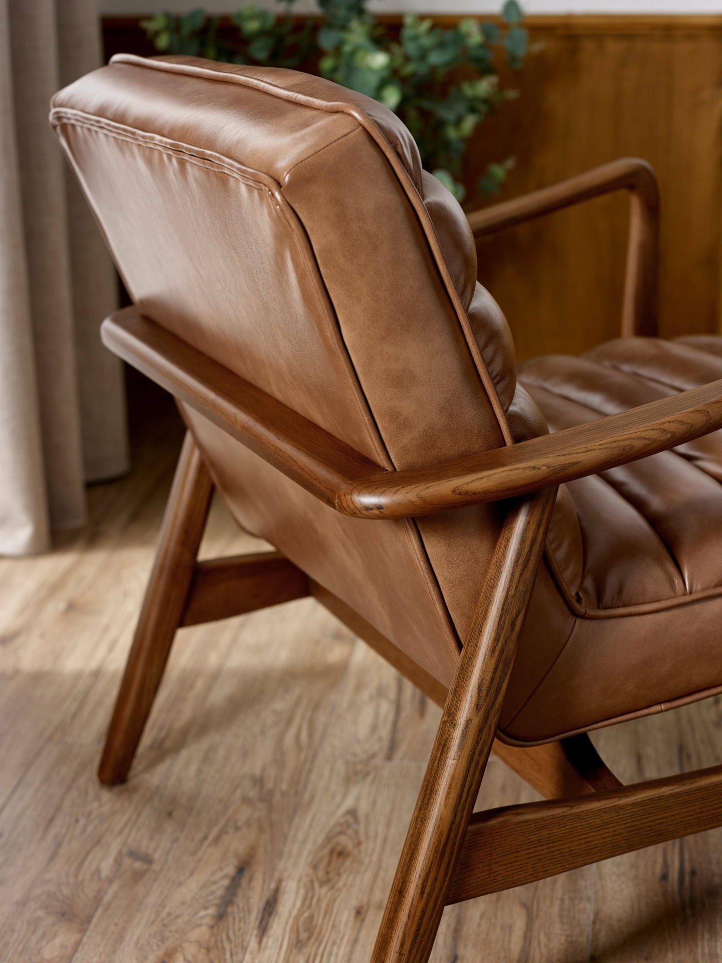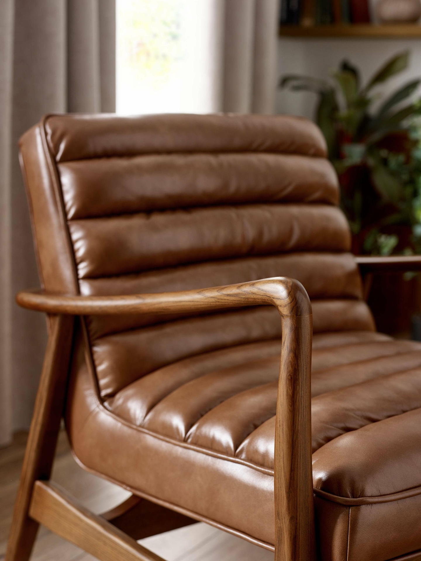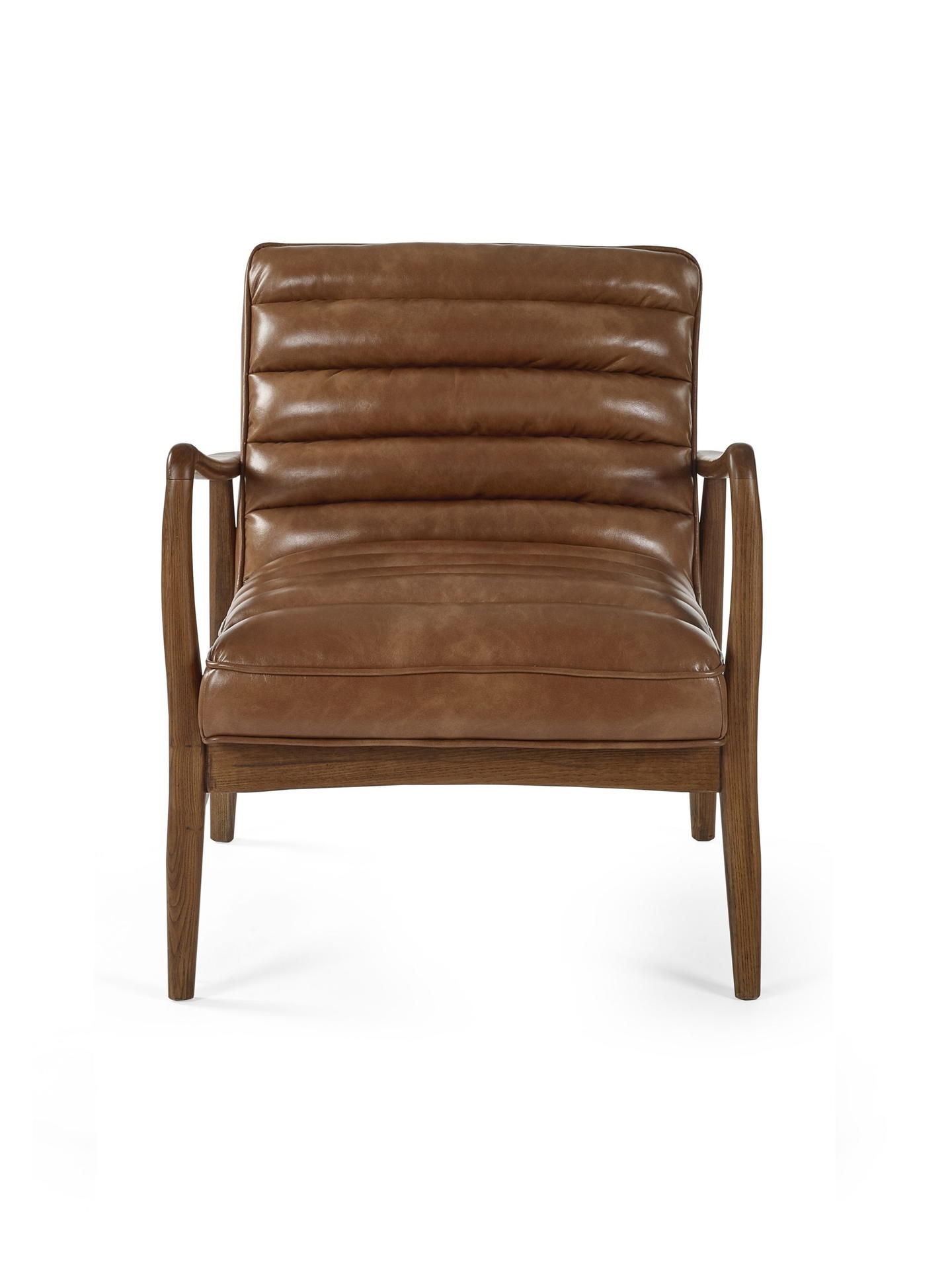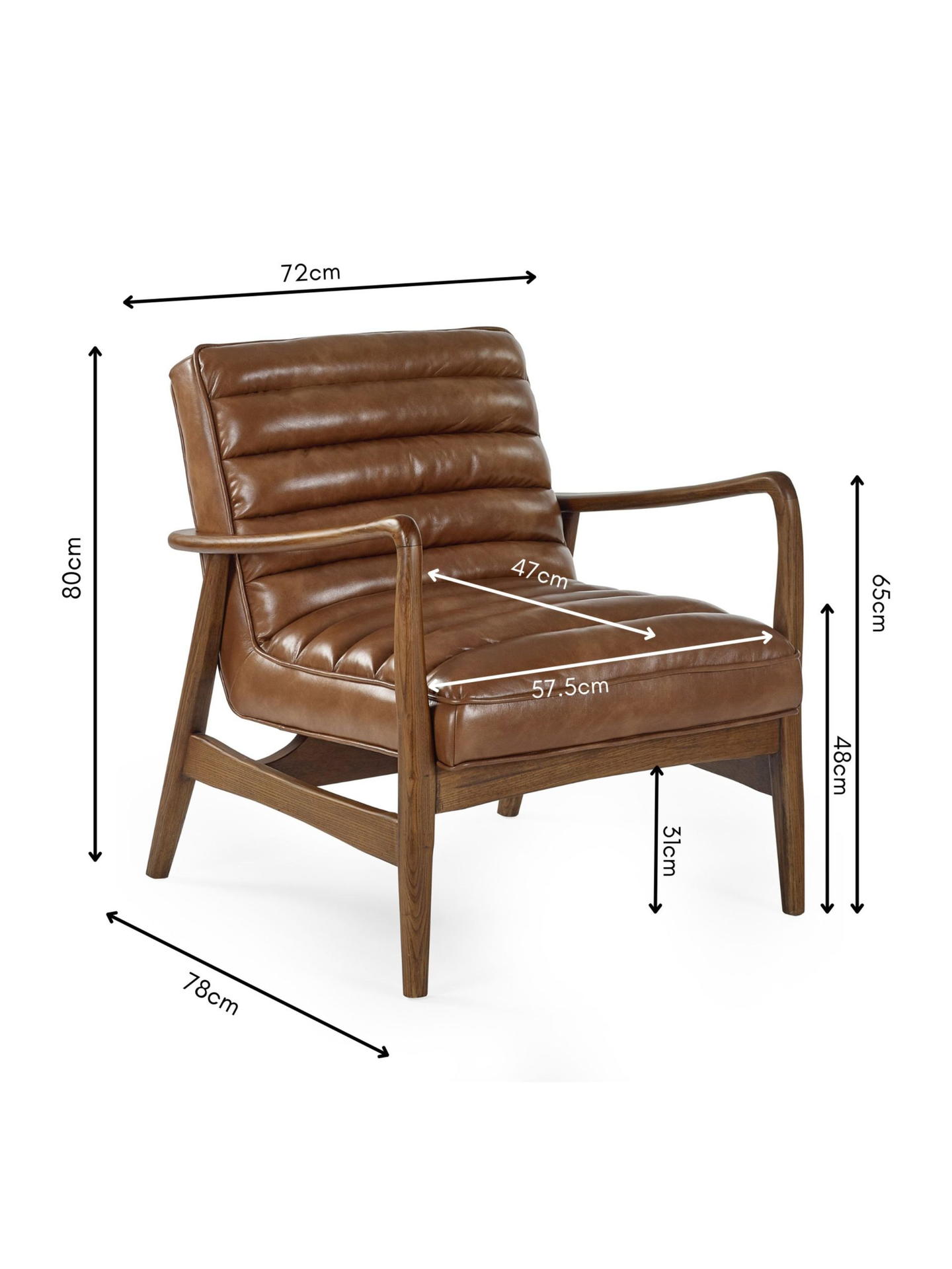 Bring timeless charm to your space with the Marshall Accent Chair in Brown. Crafted with a solid wood frame that showcases natural beauty, it pairs durability with sleek design. The ribbed cushioned seat, upholstered in smooth vintage brown faux leather, offers exceptional comfort and a retro-inspired look. Whether enhancing a cosy corner or anchoring your decor, it makes an inviting and stylish addition to any room.