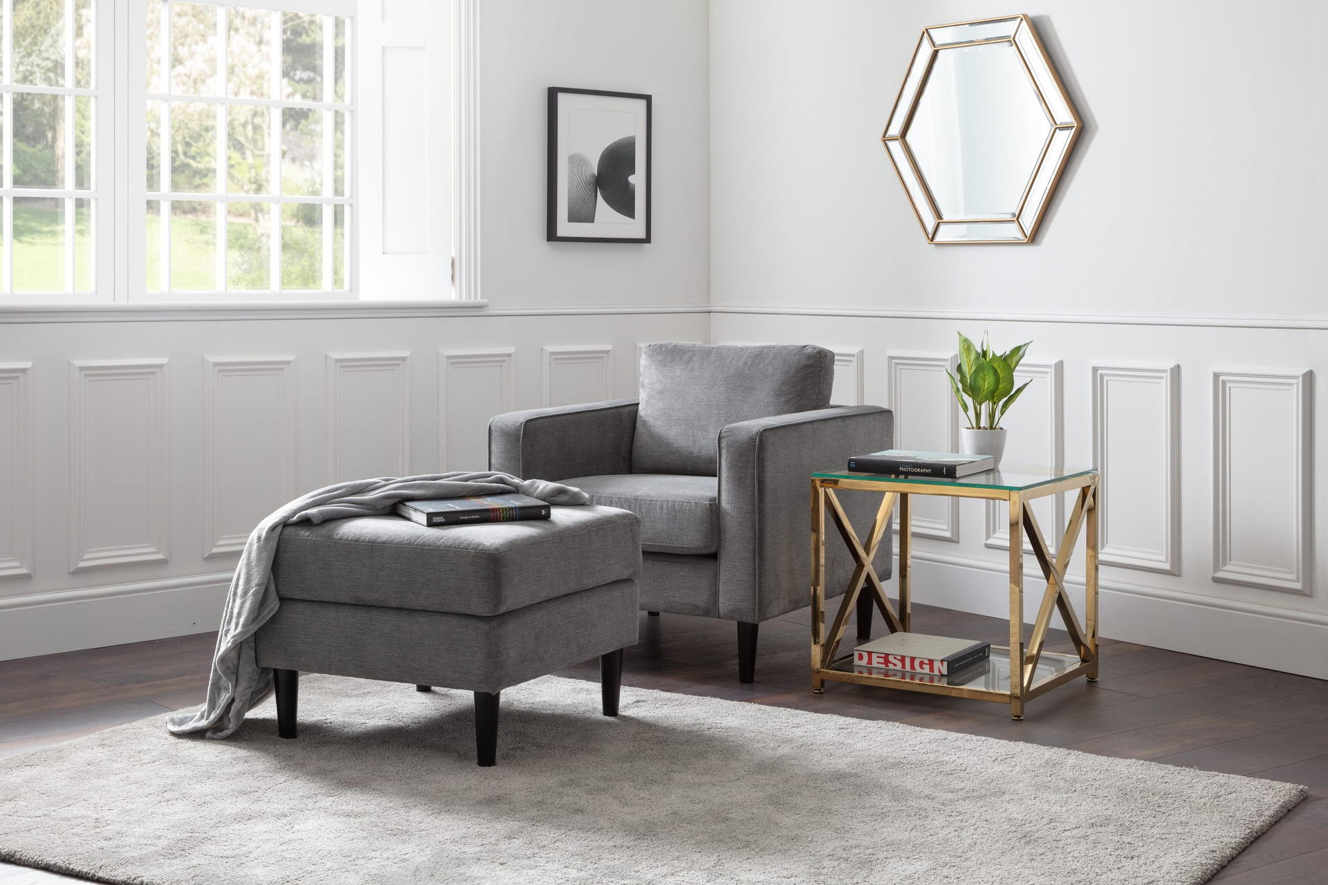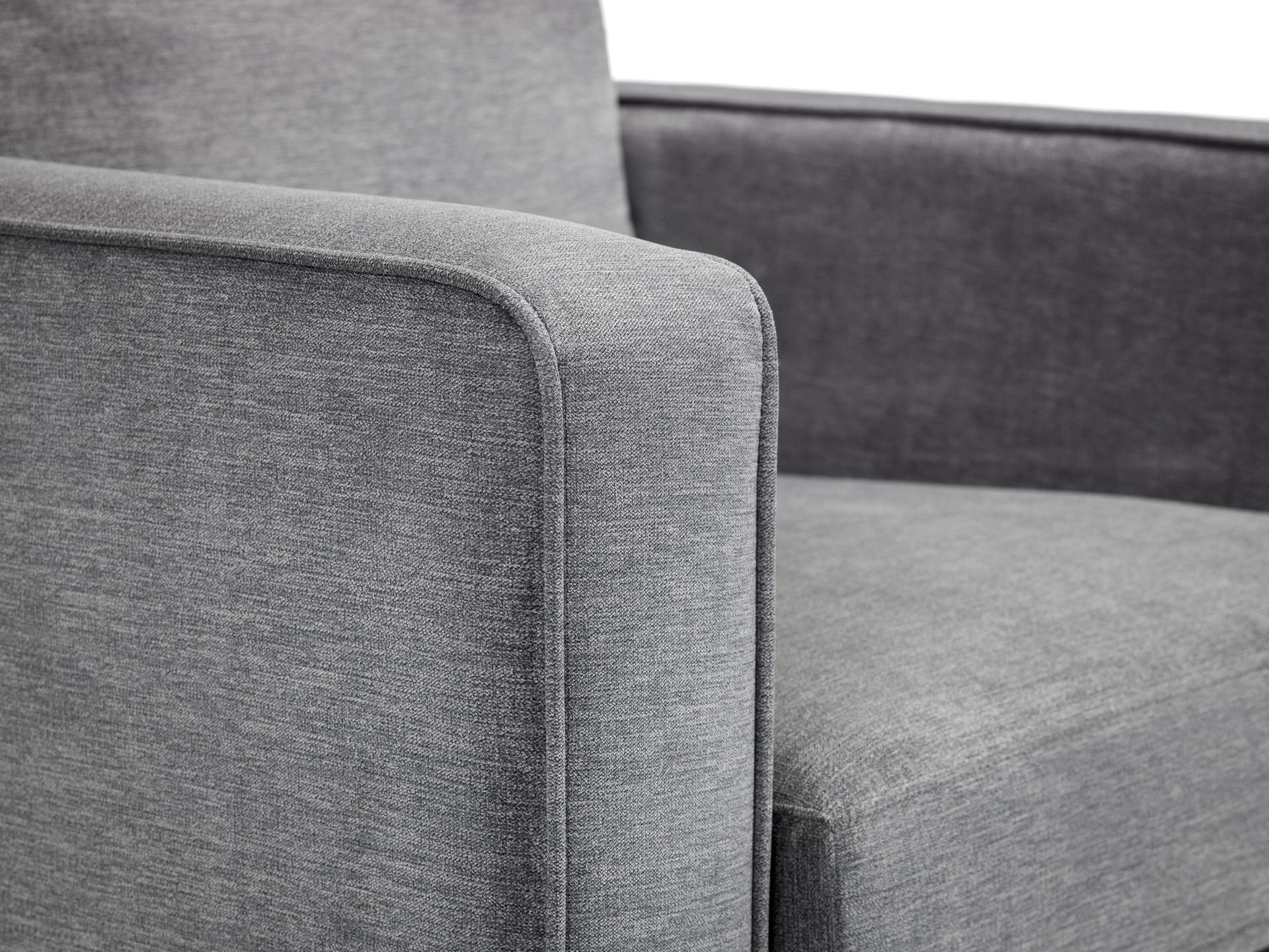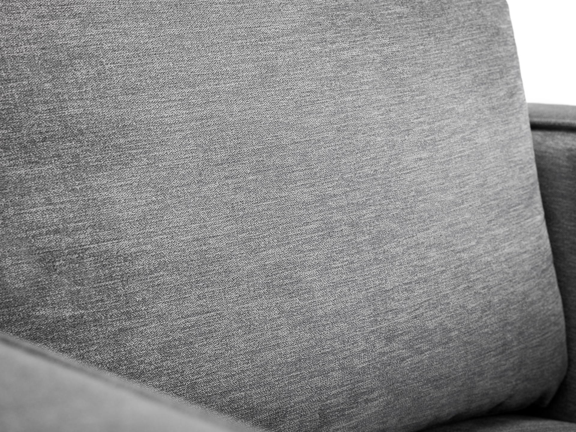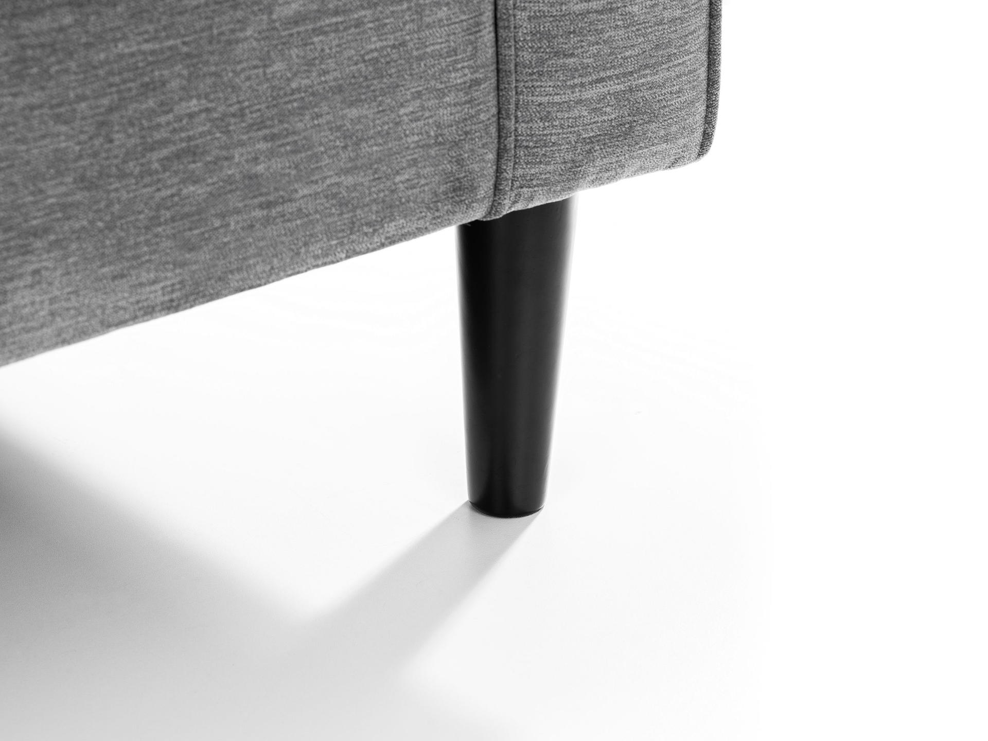 Finished in a dark grey chenille fabric.