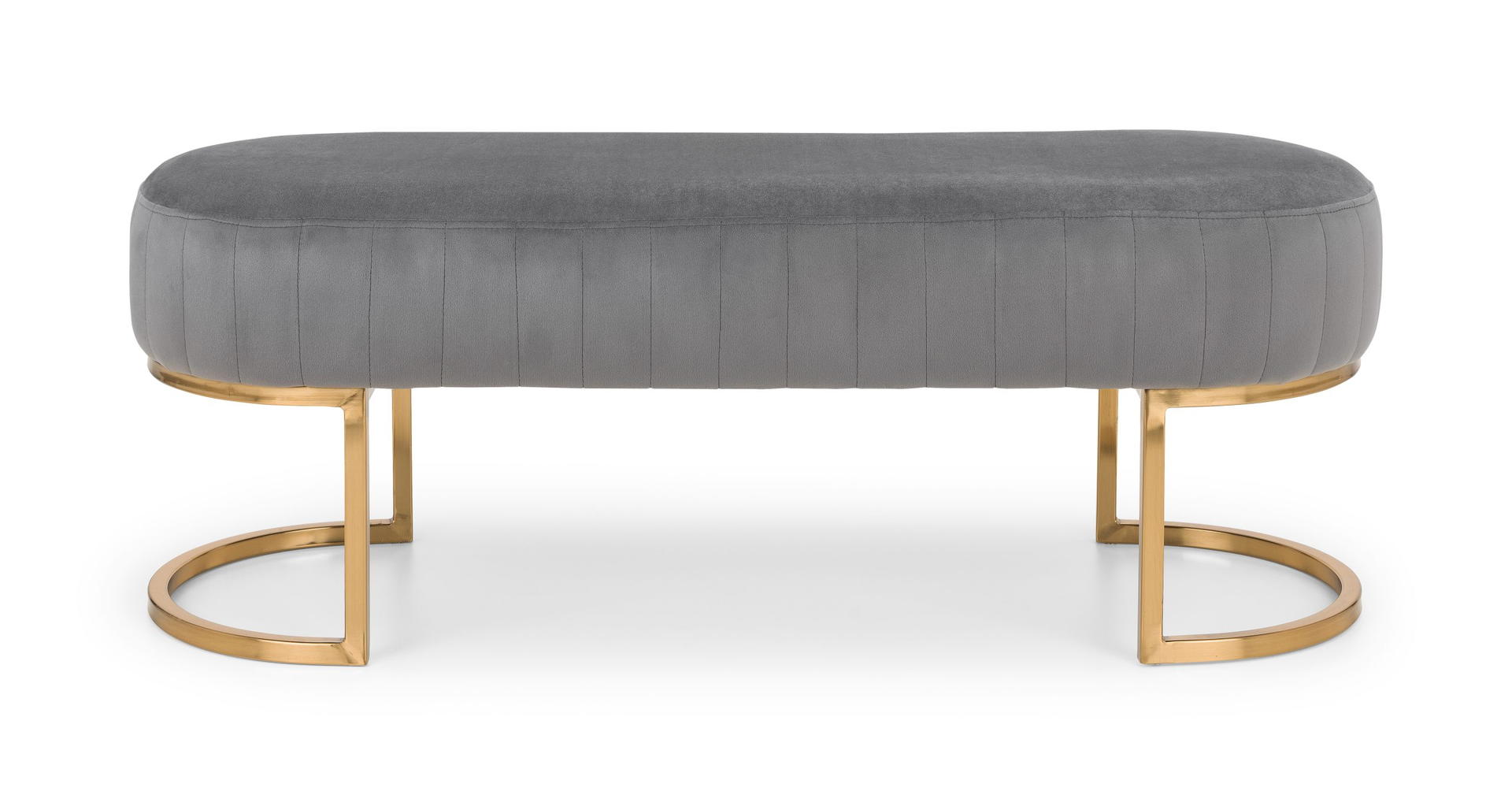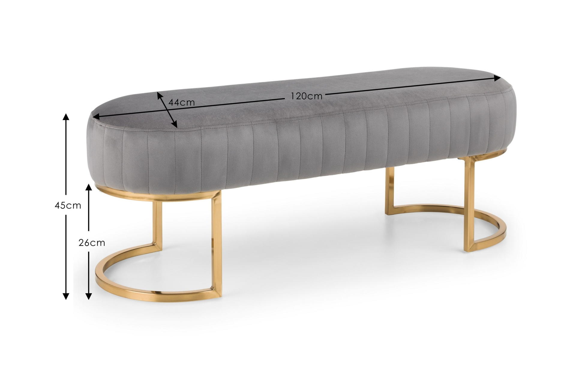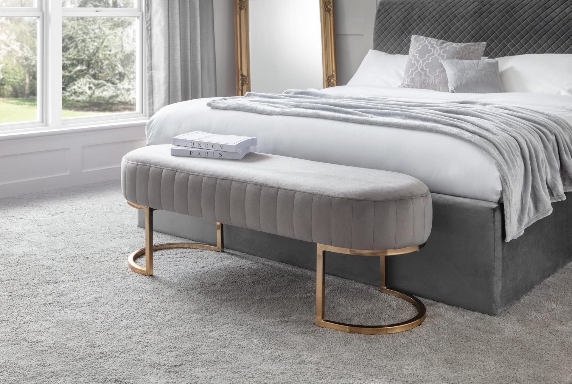 Designed in a luxury velvet, our Harrogate bench features an elegant, unique design that fits beautifully amongst a large range of interior décor styles. The contrast of the slick gold legs make this piece versatile, yet classy. Whether placed in the bedroom, or part of the hallway, this piece is sure to be a showstopper in any home.