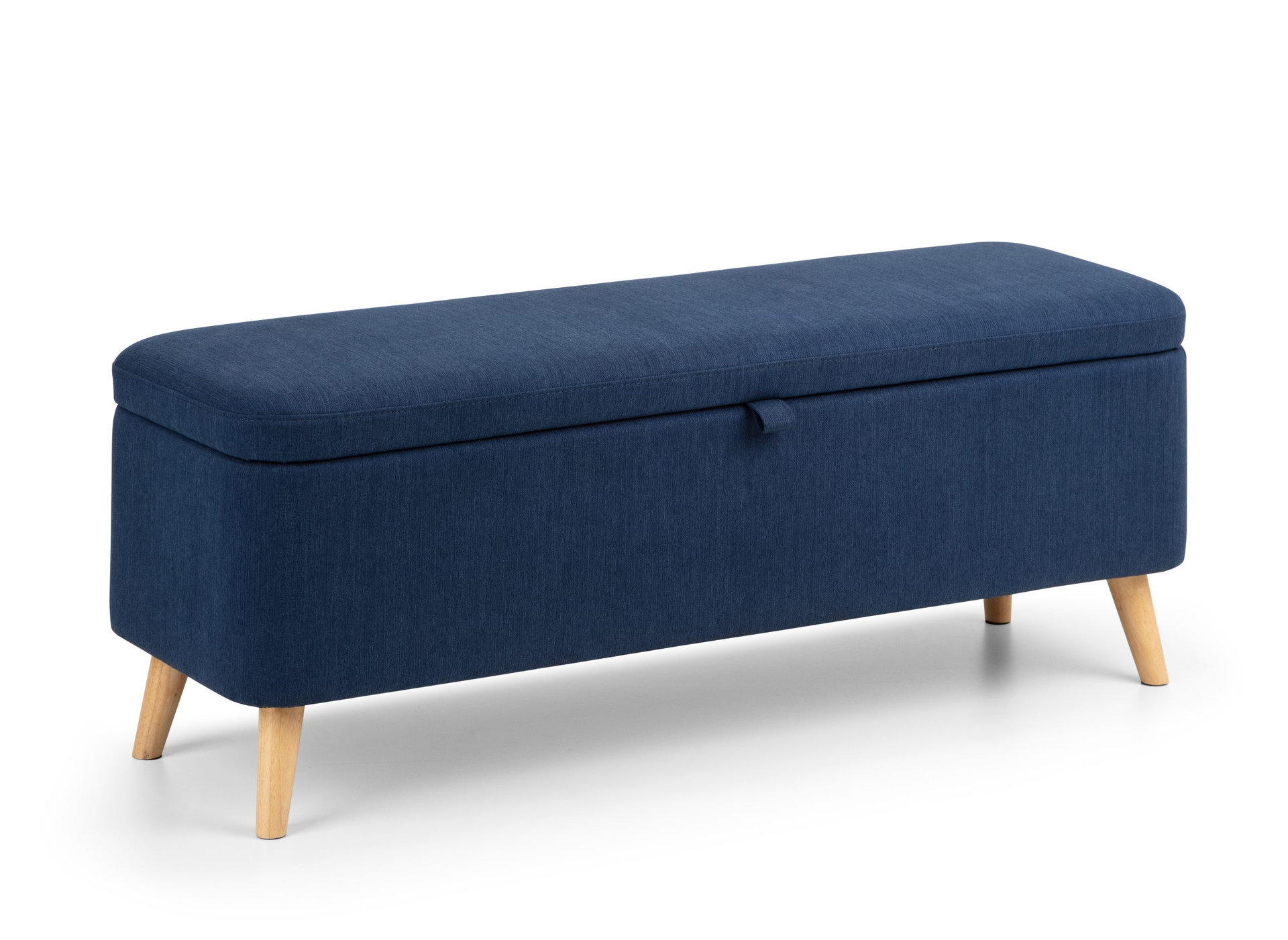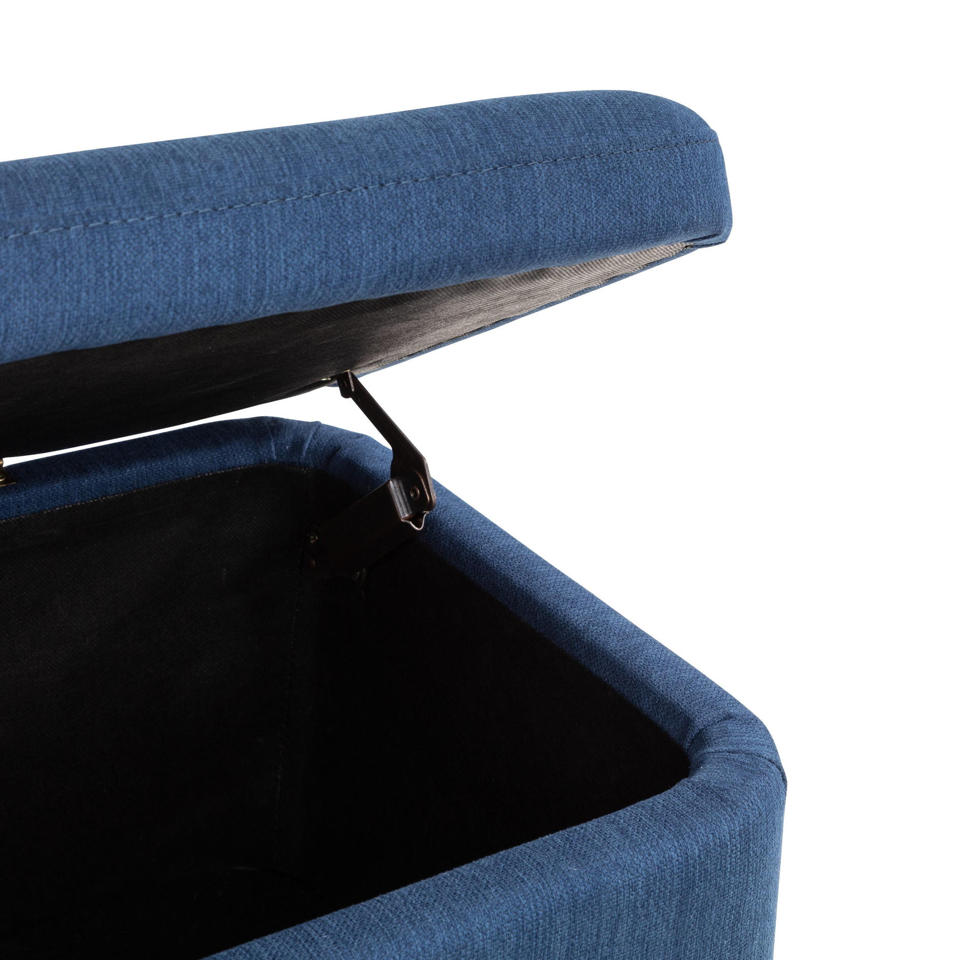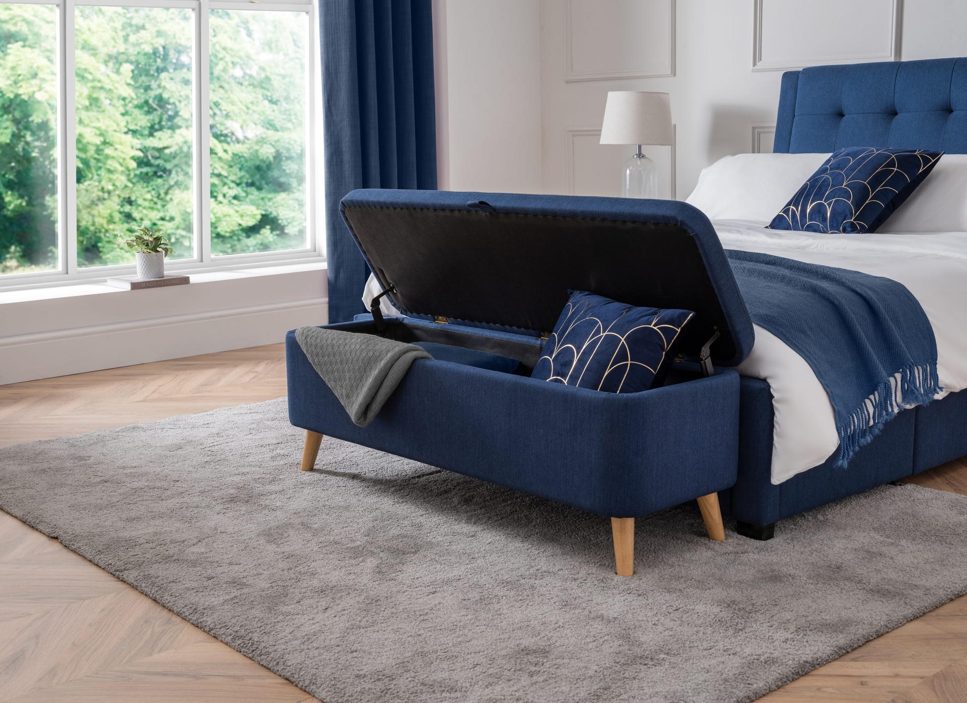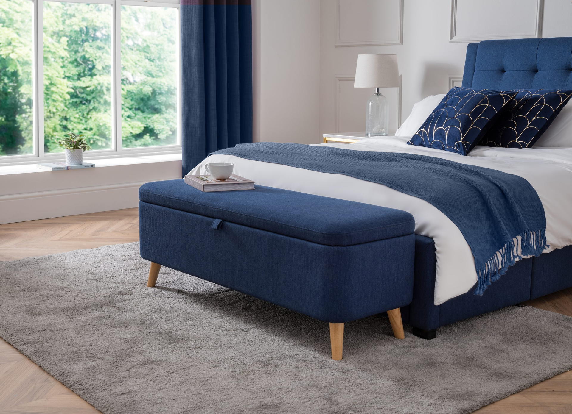 Perfectly proportioned to sit at the end of the bed, this contemporary Astrid blanket box is upholstered in a crisp blue linen fabric. This contemporary, Scandinavian design fits perfectly with a wide range of bedroom décor. The perfect storage for your cushions, linens, or duvets with the ease of soft close hinges.