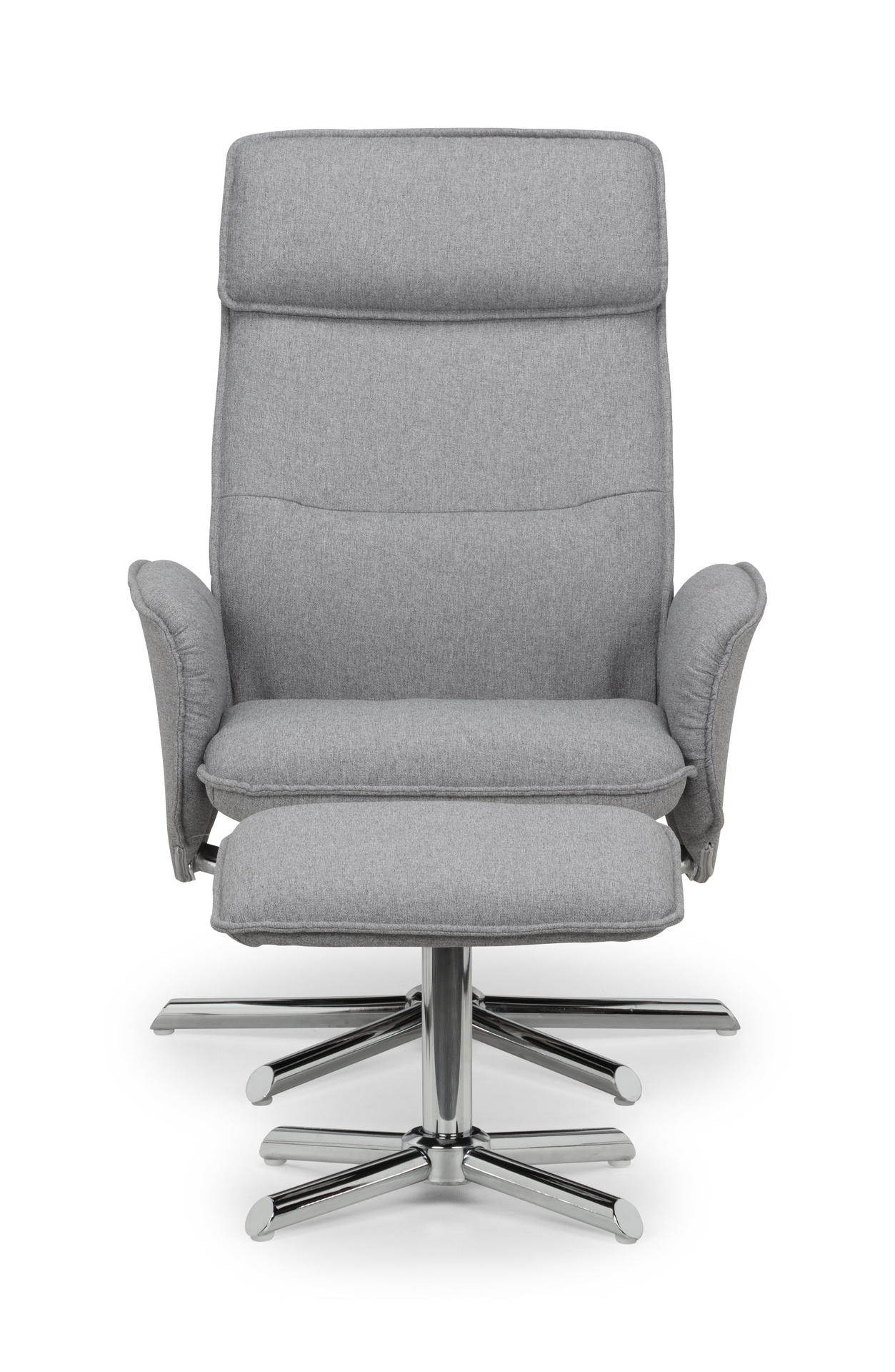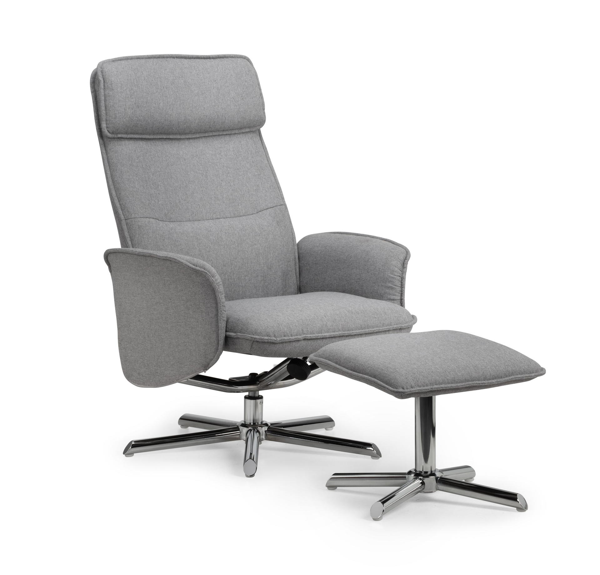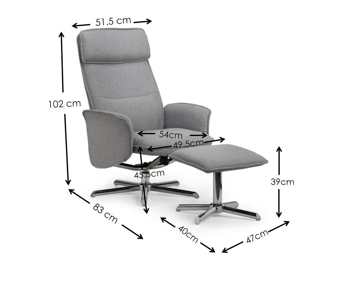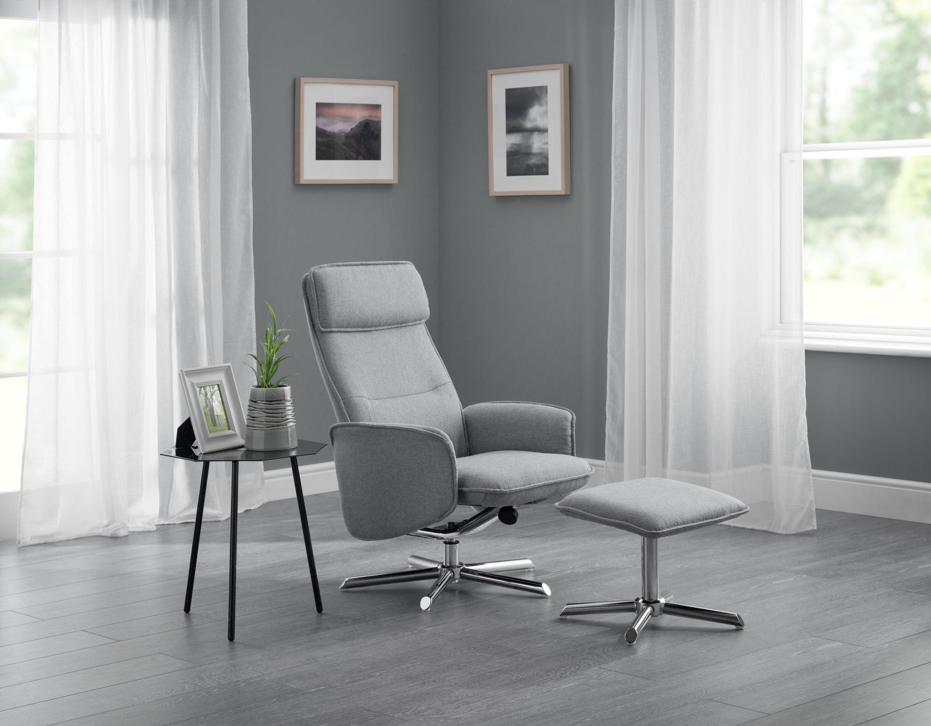 The Aria Recliner is beautifully upholstered in grey linen fabric with a stunning chrome base. Featuring a padded headrest and footstool to provide utmost comfort, this modern chair is suitable for a wide range of decor. Not only does this chair recline, it also swivels allowing you to reach your preferred position at ease.