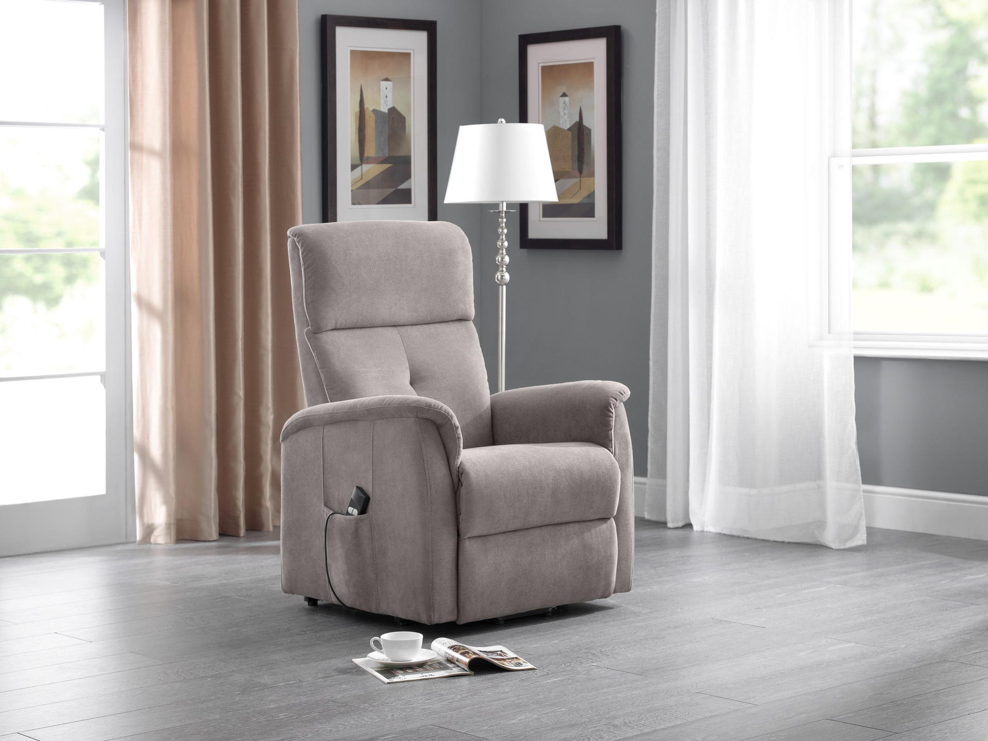 The Ava Rise and Recline Chair is a deep, soft and extremely comfortable armchair. Presented in an attractive taupe fabric, Ava is both compact and extremely durable and complements most decorative styles. A motorised mechanism provides a helpful lift out or relaxing recline position at the touch of a button. Ava offers, style, comfort and great functionality, and couldn’t be easier to operate.